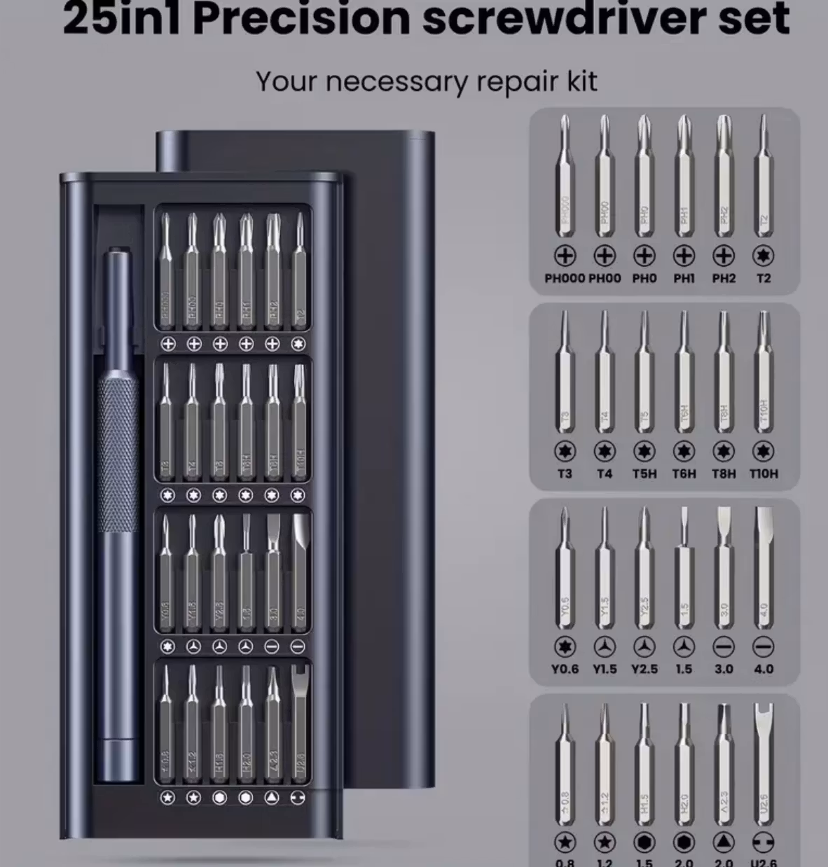 - Professionellt 25-i-1 precisionsset för småskalig reparation.