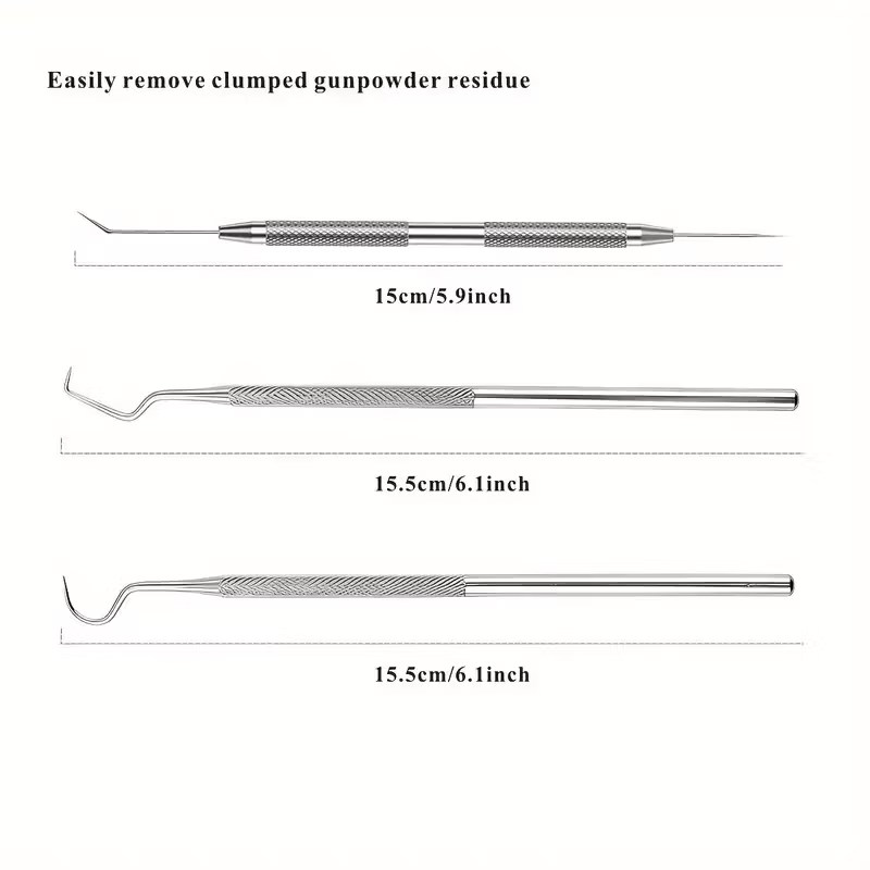 Detta set med 3 dubbelspetsade metallpickar är ett perfekt verktyg för noggrann vapenvård. De minimalistiska pickarna är designade för att effektivt komma