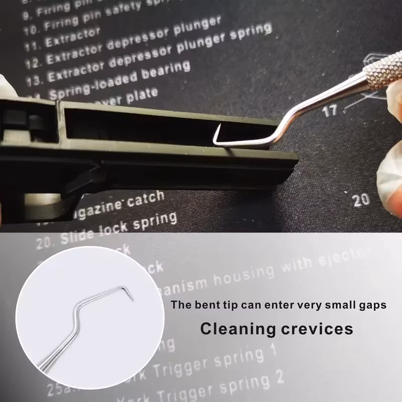 Detta set med 3 dubbelspetsade metallpickar är ett perfekt verktyg för noggrann vapenvård. De minimalistiska pickarna är designade för att effektivt komma åt små skrymslen och svåråtkomliga områden på ditt vapen. Perfekt för att avlägsna smuts, skräp och andra rester som samlas under användning, vilket säkerställer optimal prestanda och långvarig hållbarhet.