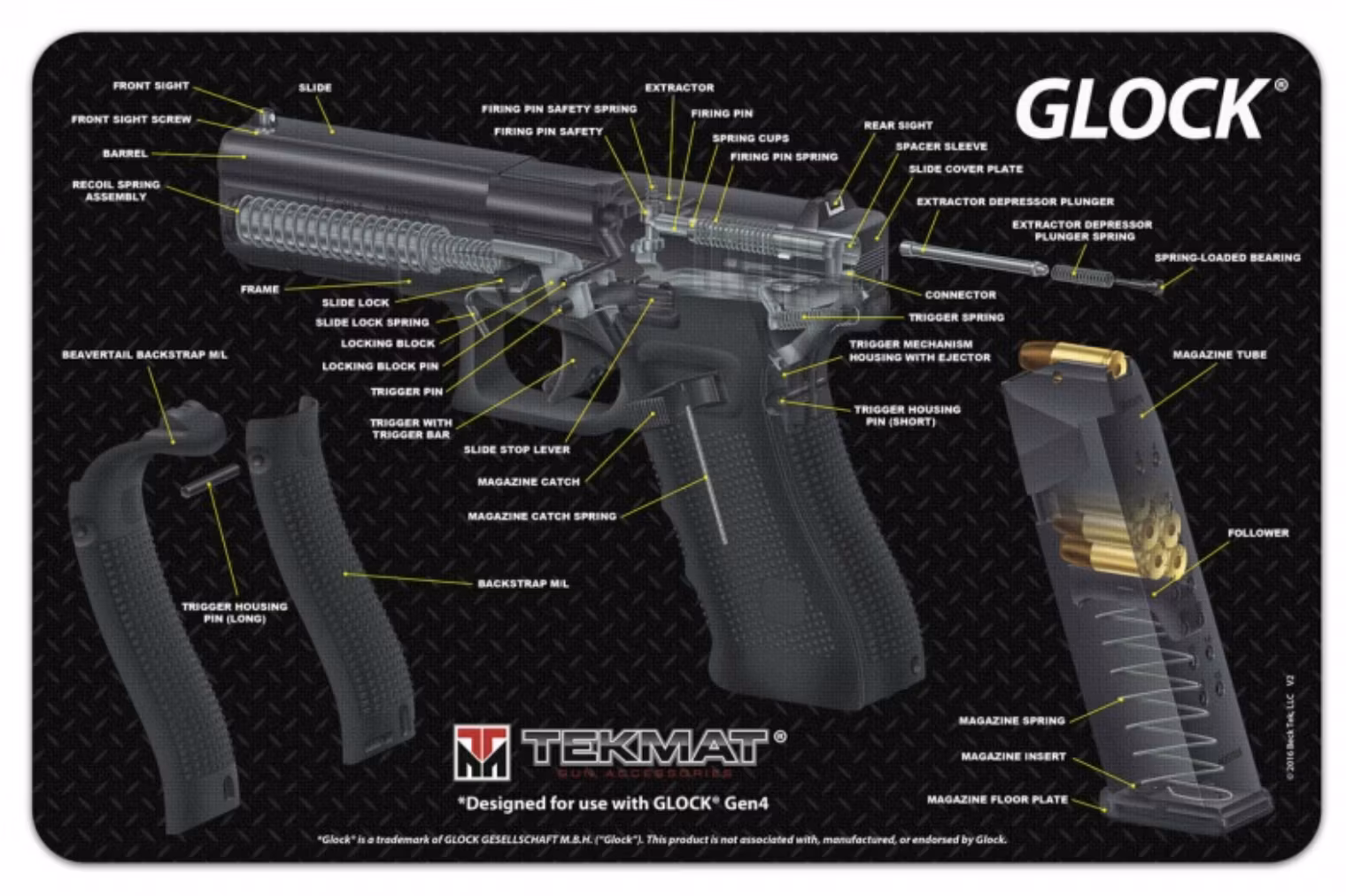 - QUALITY GUN CLEANING MAT - This Glock gun cleaning mat by TekMat is made to exacting standards. This begins with the water-resistant, scratch proof, fade and oil resistant dye-sublimation printing. This heat transferred printing impregnates the ink into the fibers for a lifetime of durability. TekMat does not silkscreen their designs like a lot of other inferior gun cleaning mat manufacturers.