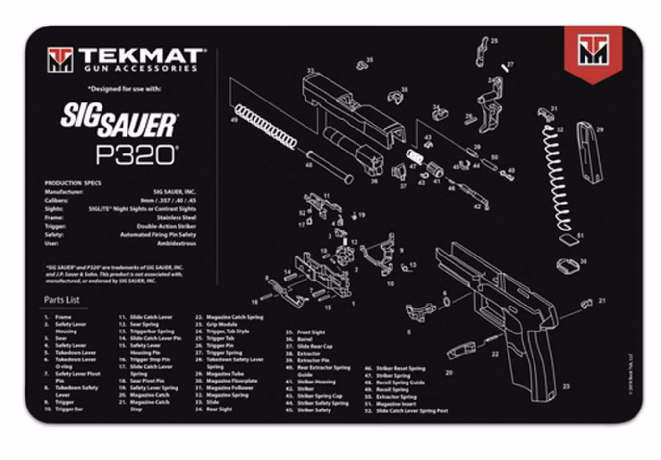 - QUALITY GUN CLEANING MAT - This Sig Sauer P320 gun cleaning mat by TekMat is made to exacting standards. This begins with the water-resistant, scratch proof, fade and oil resistant dye-sublimation printing. This heat transferred printing impregnates the ink into the fibers for a lifetime of durability. TekMat does not silkscreen their designs like a lot of other inferior gun cleaning mat manufacturers.