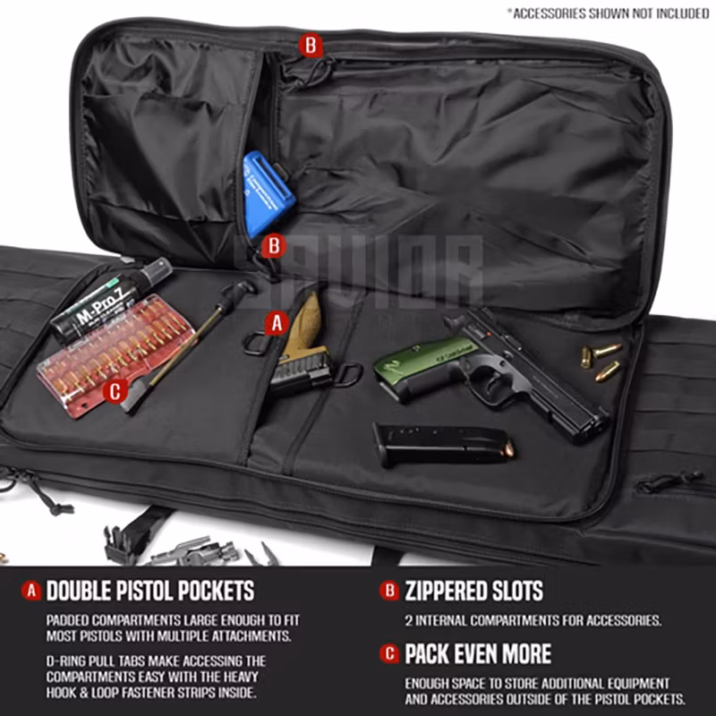 ✅ Pistolförvaring – Två stora vadderade pistolfack med extra dragkedjefickor för magasin och tillbehör